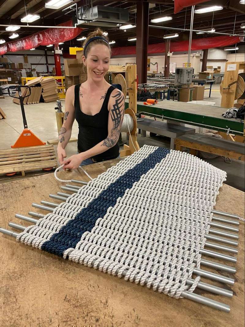 Downeast Packaging Solutions associate Cody Ashby is seen here weaving a doormat for DPS’s customer, The Rope Co. In a new partnership, Ashby will soon deliver orders for customers of Machias’ Whole Life Natural Market. Photo courtesy DPS