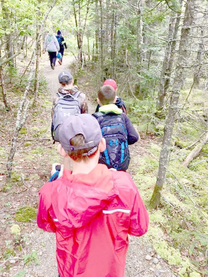 Beals Elementary School students in grades 5 through 8 trek through the woods of The Nature Conservancy’s Great Wass Island Preserve as part of a two-day field trip last week under the auspices of the Maine Outdoor School. Photo courtesy Suzanne Carver. Story found on page 10.