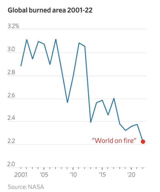 The recent Canadian wildfires (and western US wildfires before them) have been widely and repeatedly attributed to climate change by the connivers and their subservient press proselytizers (including our own local Quoddy Tides.) But the data record showing less global burning has been ignored and suppressed, even when (or maybe especially when) presented in the Wall Street Journal by Bjorn Lomborg courtesy of NASA.