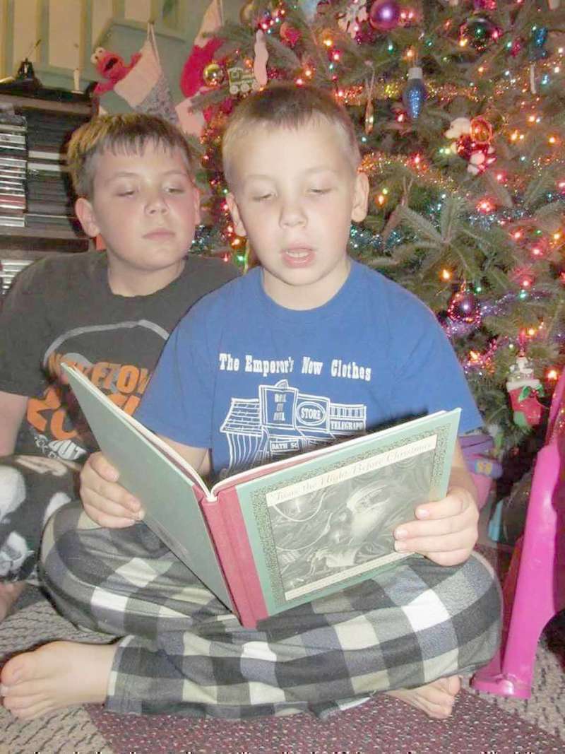 Izyck and Blake Archer of Dennysville sit in front of their family’s Christmas tree every year for the family tradition of reading Twas the Night Before Christmas aloud. Photo courtesy Alison Archer.