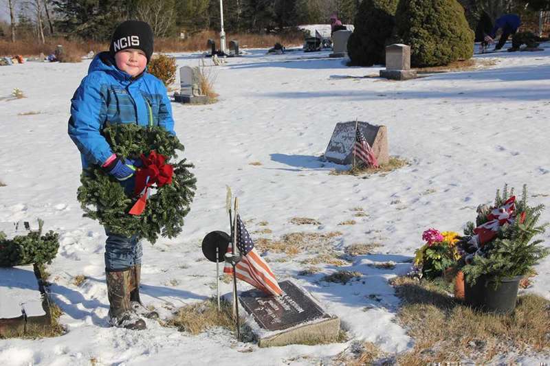 Konner Strout, seen here laying a wreath on the grave of veteran Paul Ramsdell, was one of many Harrington students who laid wreaths on graves at the Foresthill Cemetery last week. Photo courtesy of Michelle McLaughlin