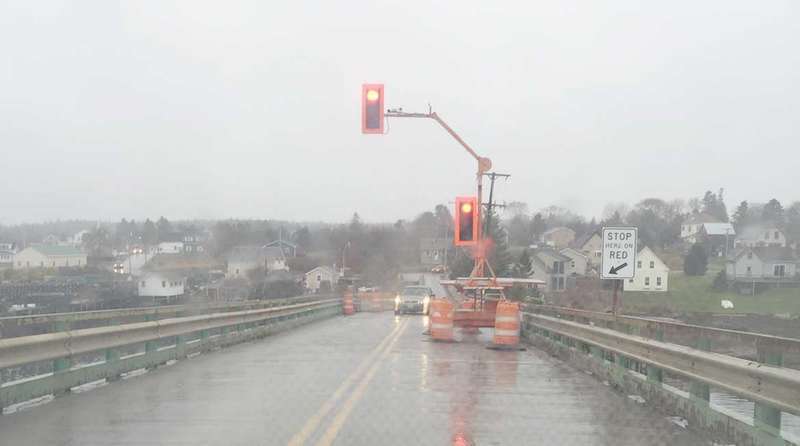 Beals can now claim the only traffic light between Ellsworth and Calais, after a complex of three was installed on the old bridge and the Beals approach. Last week, work crews tore up the tar on the northbound lane of the Beals end and sent earth moving equipment onto the beach at low tide to shore up the rock bound approach. Traffic at the Beals end of the old bridge is limited to one lane, so travelers will need to add a couple of minutes to their travel time while work progresses. Photo by Nancy Beal